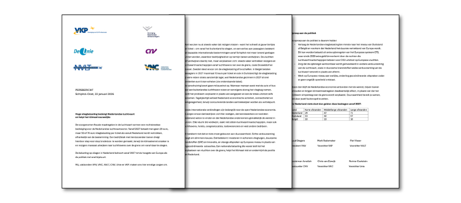 Samen met cabine- en grondbonden deelt de VNV enkele standpunten over vliegtaks, en wil graag aan de politiek laten weten dat de luchtvaartsector verenigd is op dit onderwerp. Den Haag wordt opgeroepen om kritisch te kijken naar de geplande verhogingen van de vliegtaks in 2027, waardoor Duitsland en vooral België op dit vlak enorme commerciële voordelen ontwikkelen ten opzichte van Nederland.